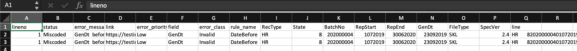 The ‘Download Invalid Records’ link generates a CSV download of all of the invalid records in the datafile. Each row represents a single error; records with multiple errors are repeated with one row per error. This enables users to filter the download as required.