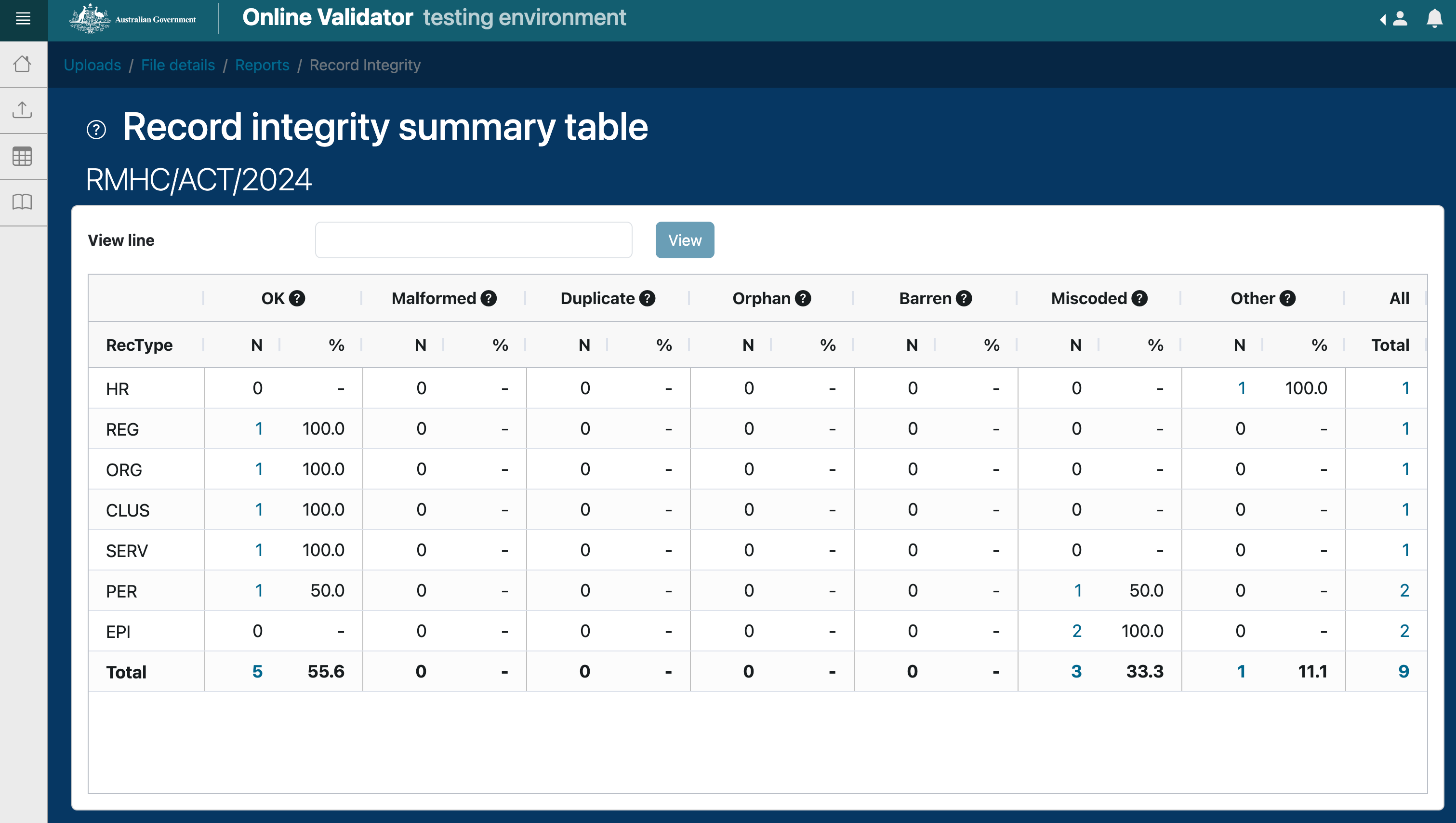 A count and percentage is displayed for all items flagged as OK, Malformed, Duplicate, Orphan, Barren, Miscoded and Other, along with a total count for each record type and for each flag category.