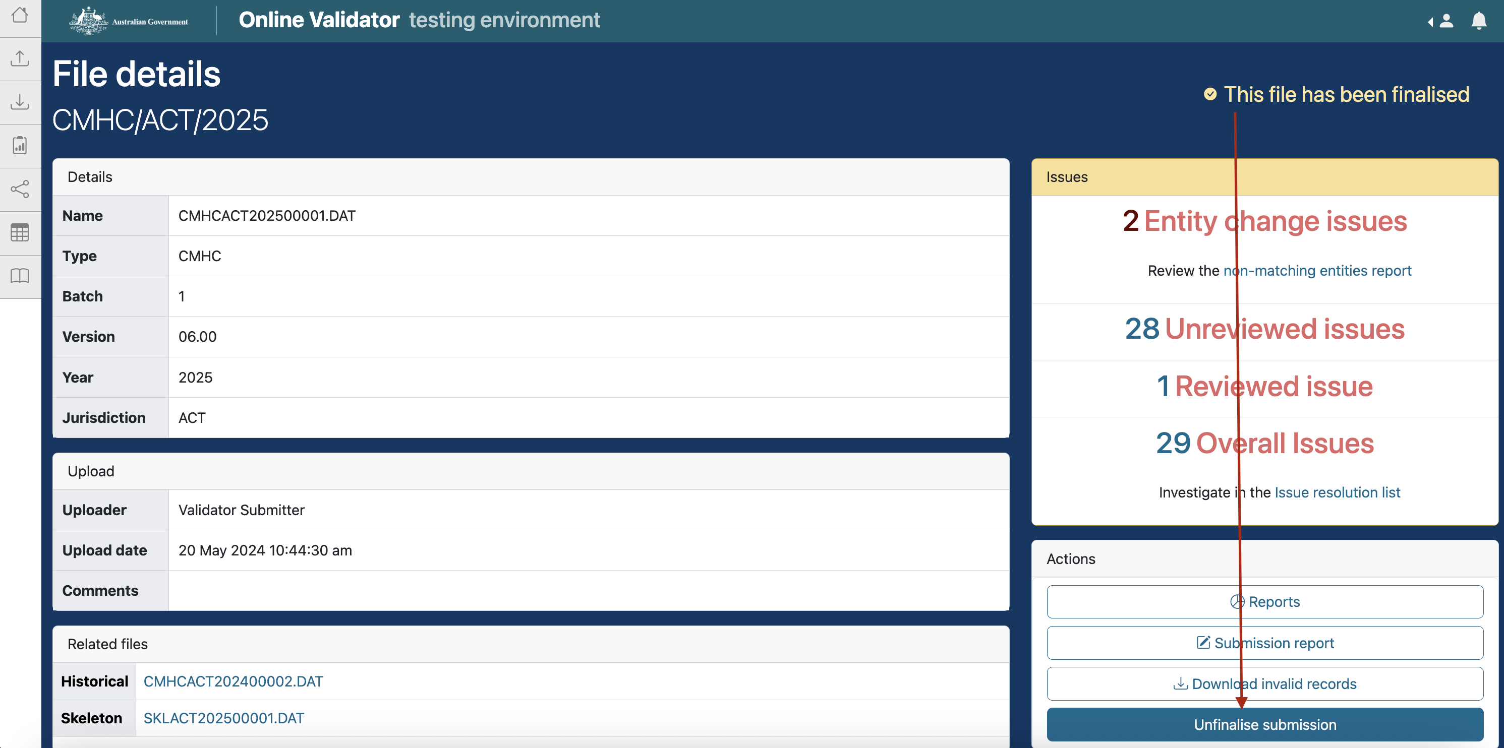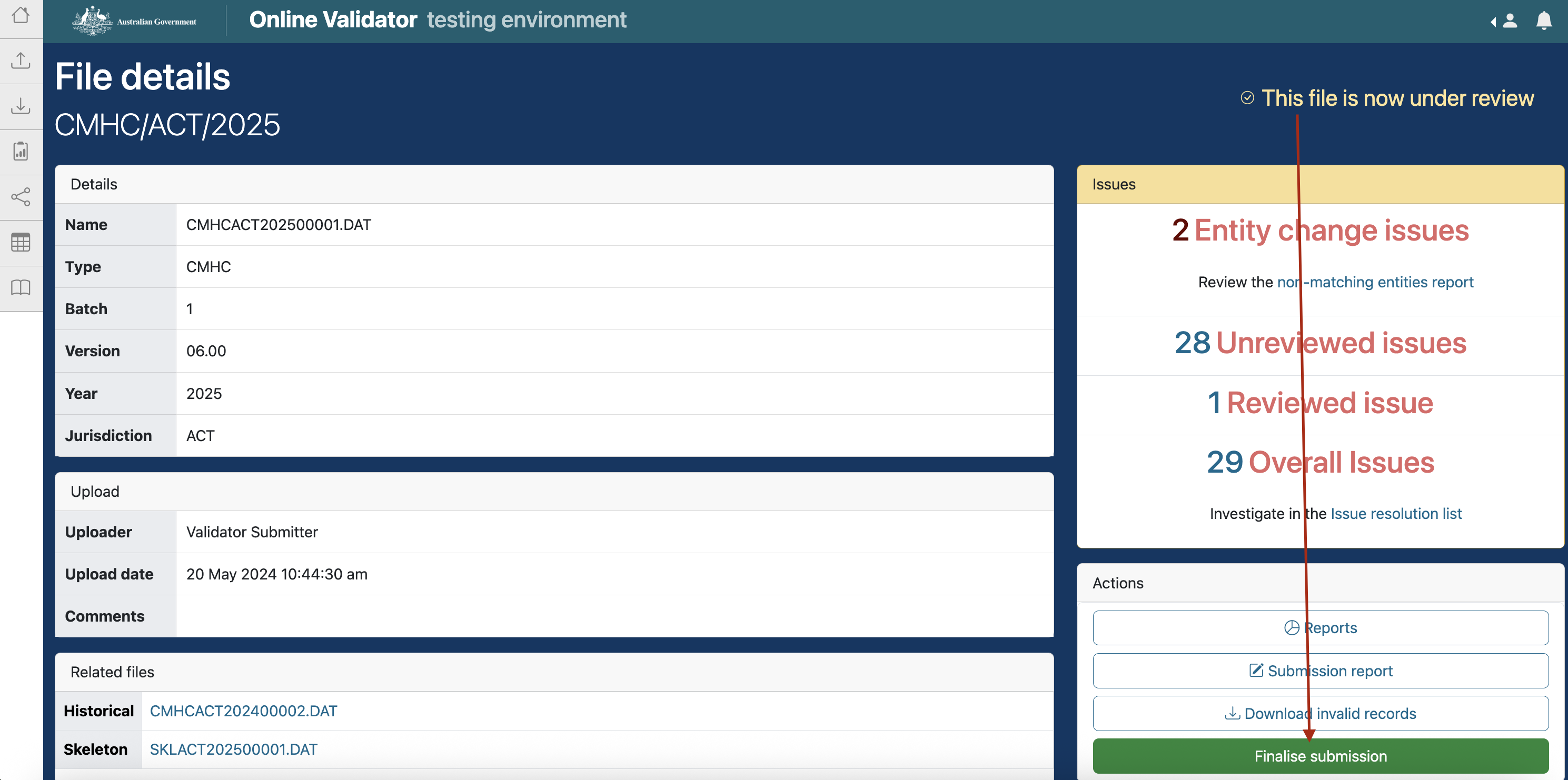 From the File Details page, an Acceptor is able to Finalise a submission at any point after accepting a file for review. Generally, any issues requiring resolution are addressed first, as once finalised, no further file versions will be accepted as replacements, and issue resolution is locked.