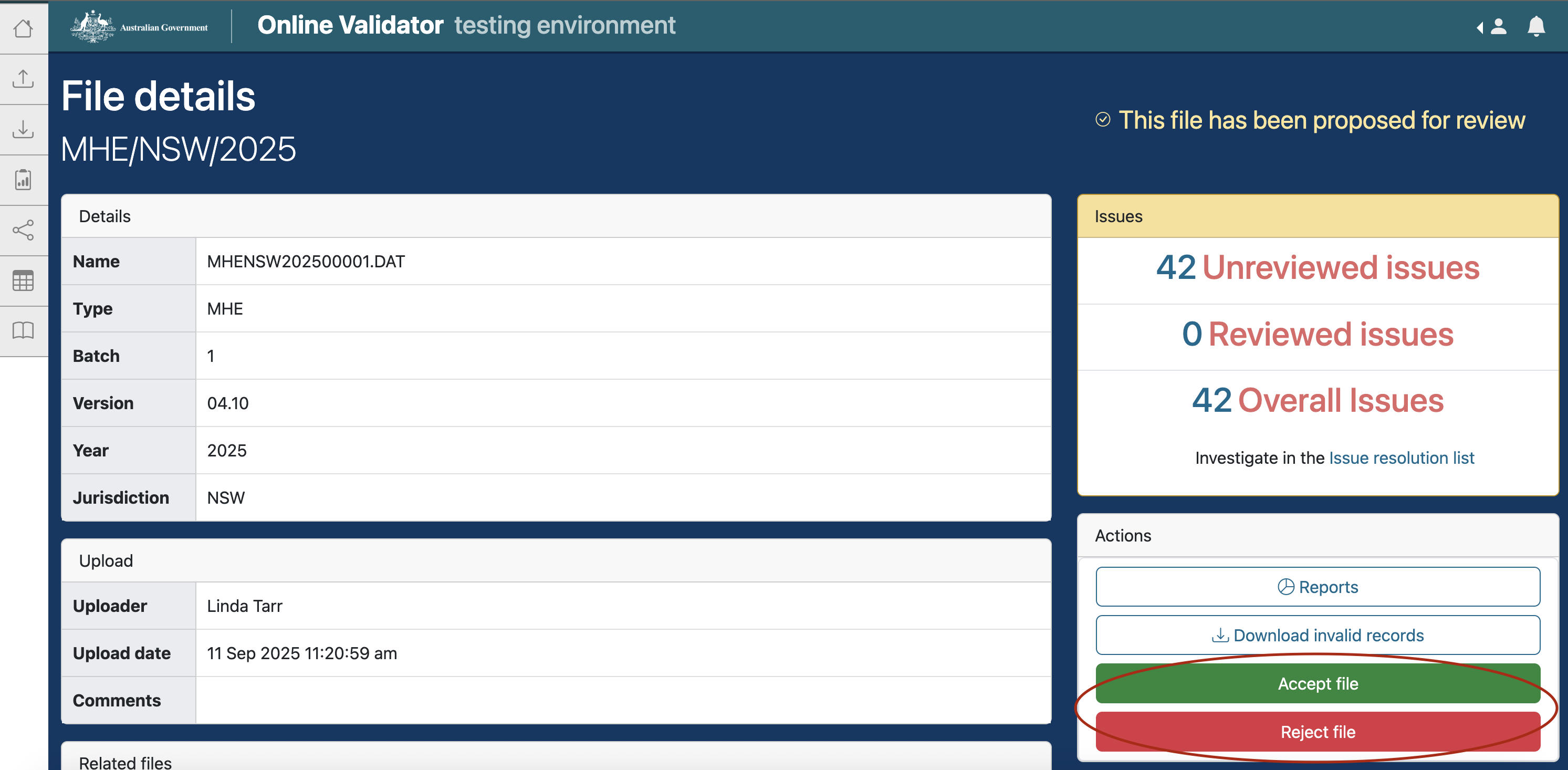 If a file is rejected, control reverts to the Submitter, who is notified that a new file upload is required. Rejection of a file recommences the submission process. Submitters are unable to upload a file that has previously been submitted.