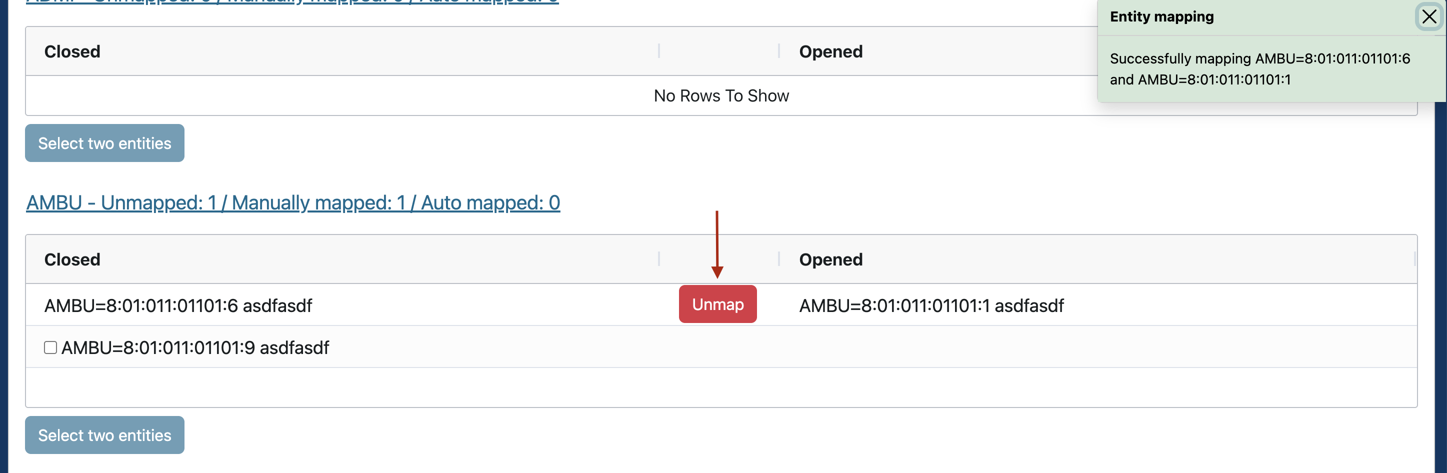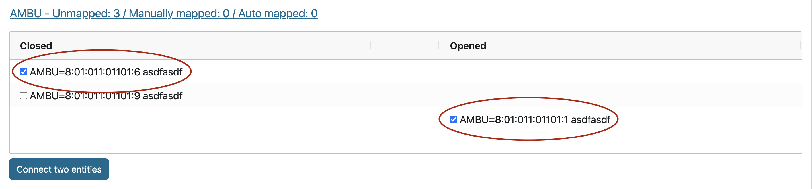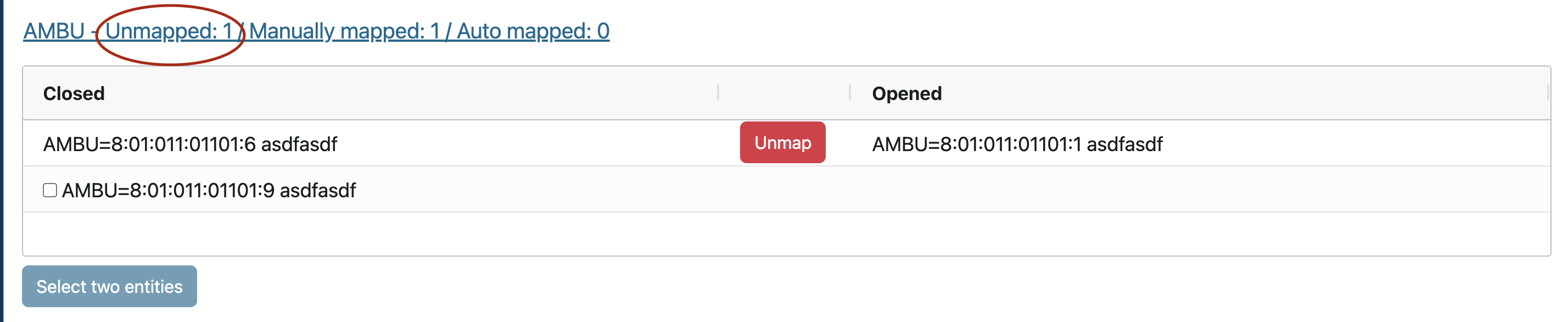 4. Continue connecting entities. Note that in the screenshot below the number of unmapped AMBU entities is now 1, rather than 3: