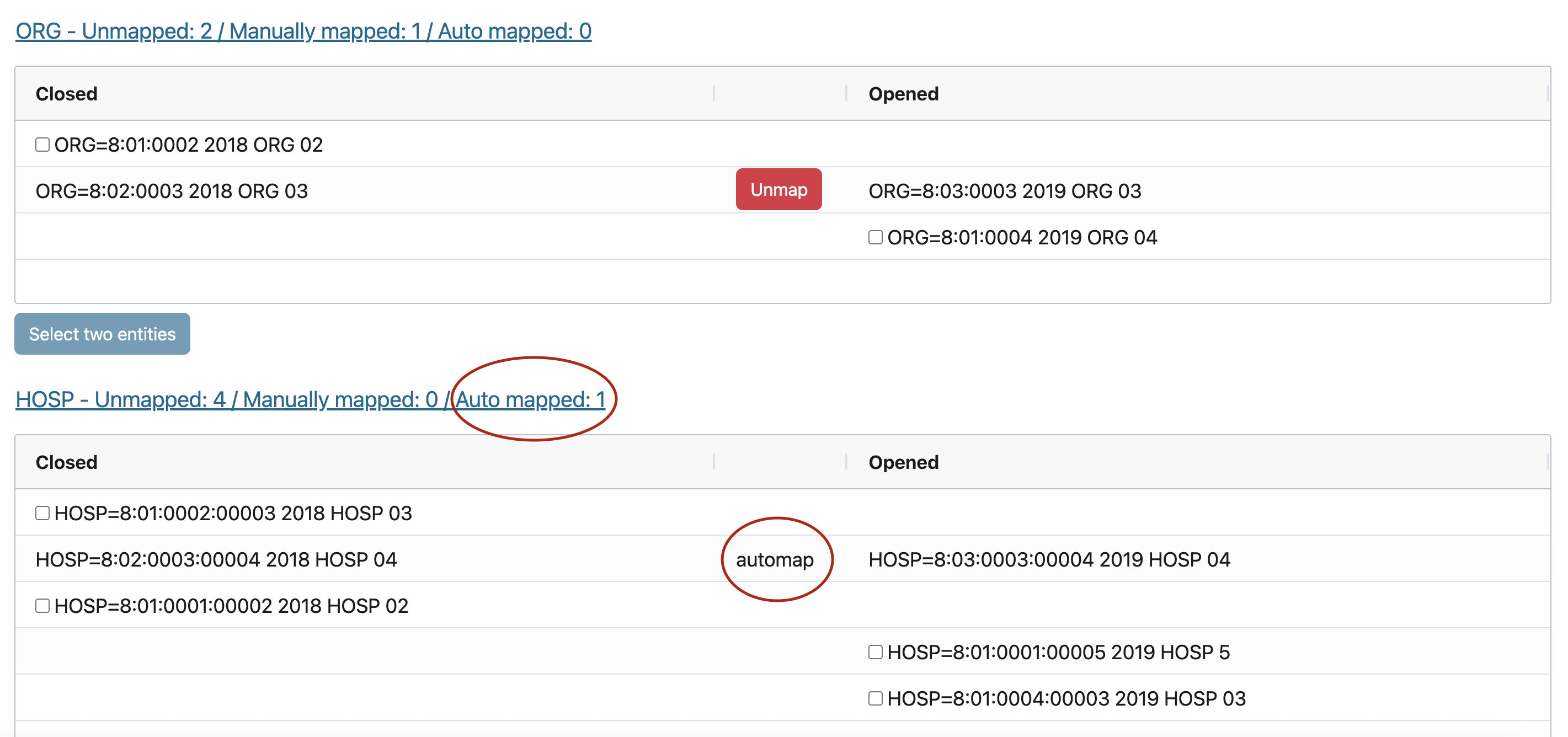 5. The HOSP display shows that some entities have been auto-mapped when ORG entities were manually mapped: